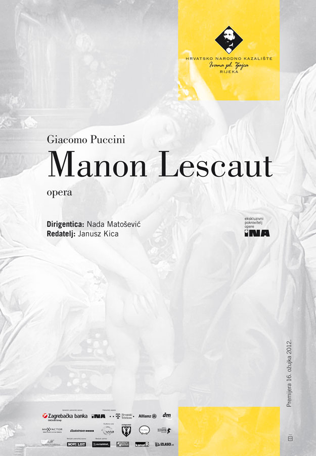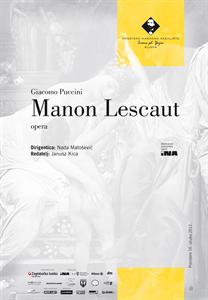 Gostioničar Mirko ČagljevićUčitelj plesa Voljen GrbacGlazbenik Kristina Kolar (Ivanica Vunić)Narednik streličara Dario BercichUžigač svjetiljki Ivan Kruljac (Martin Marić)Pomorski kapetan Saša MatovinaVlasuljar Marijan Padavić Dirigentica Nada MatoševićRedatelj Janusz Kica Scenograf Marko JapeljKostimograf Leo Kulaš Koreograf Žak ValentaOblikovatelj svjetla ZoranMihanović Asistent dirigentice Igor Vlajnić Korepetitori Ana Šabašov, Ana AnconelliZborovođa Igor Vlajnić Koncertni majstor Romeo DruckerInspicijentica Vesna MarinacŠaptačica Nina SimčićPremijera: 16.3.2012. ekskluzivni pokrovitelj opere  Zacijelo najveći skladatelj postverdijanske generacije Giacomo Puccini uhvatio se tada popularnog predloška priče o Manon Lescaut. Zadatak je, tim više, bio teži što je Massenetova opera „Manon“ još uvijek u to doba plijenila pažnju publike i analitičara. Stoga i ne čudi što je kroz neprestano traganje kako da se što bolje usklade forma cjeline opernoga djela kroz potpuno zaokružene segmente priče, Puccini dodavao, mijenjao i konsultirao. Upravo je čudesan broj libretista toga djela, a upravo taj broj svjedoči o Puccinijevu nastojanju ka savršenom tekstualnom predlošku i zaokruženosti djela. U ovome djelu, praizvedenom 1893., razvidan je utjecaj Verdija i Wagnera, no i sve snažniji utjecaj prodornoga Ponchiellijeva stila. Neprestano dorađivanje, želja da svaki čin bude samostalno strukturiran, svijest o strukturama i svijest o operi kao zaokruženu djelu u svim njezinim elementima, podudarnost između teksta, događanja, psihologije te stanja i atmosfere – nastojanje na svim tim elementima stvorilo je iznimno djelo kojim je Puccini započeo međunarodnu karijeru. Ovo je djelo prvo u nizu njegovih remek-djela u kojem je skladatelj pronašao svoj autentični put glazbenog dramatičara. | | |