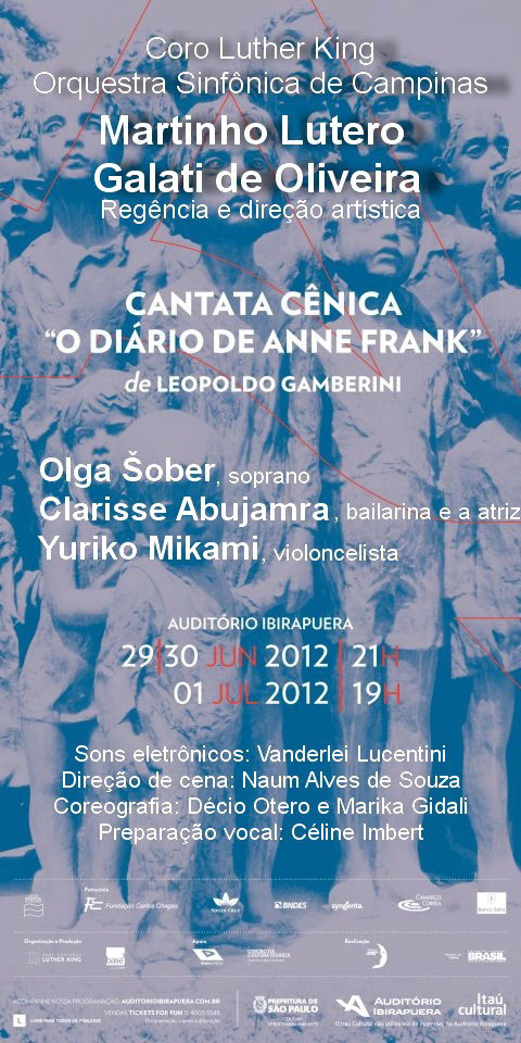 Kantatu je skladao Leopoldo Gamberini u suradnji s Anninim ocem, Ottom Frank, a ovo je bio prvi put da je predstavljena u integralnoj verziji (praizvedba je bila u Genovi 1965. u smanjenoj glazbenoj formi). Uz mnoge zvučne i vizualne efekte što ih je osmislio dizajner Kika Farkas te u koreografiji Decia Otera Stagiuma, na jedinstven je način ispričana priča o djevojci koja je bila žrtva holokausta. Važno je spomenuti da je dirigent Martinho Lutero Galati de Oliveira dobio smjernice za izvedbu ove kantate izravno od autora. „Multimedijalna kantata „Dnevnik Anne Frank“ okupila je 180 izvođača iz cijelog svijeta u prekrasnom Auditorijumu Ibirapuera kojeg je projektirao Oscar Niemeyer. Prve dvije izvedbe bile su odavno rasprodane a na posljednjoj, u Parku Ibirapuera koji se nastavlja iza pozornice ovog jedinstvenog Auditorija, prisustvalo je desetak tisuća gledatelja“, rekla je riječka primadona i nacionalna prvakinja opere Olga Šober. „Čast mi je bila sudjelovati u ovom projektu, uz doista izvanredne soliste. Suradnja s maestrom Luterom Galatijem bila je jedinstvena. S njime sam prvo radila u Rijeci i u Milanu, a posljednja dva tjedna ovdje u Sao Paulu. Prenio mi je sve želje nedavno preminulog kompozitora Gamberinija. A nadam se i vjerujem da sam pjevajući vrlo tešku dionicu Anne Frank ispunila očekivanja svih. U Sao Paulu sam inače održala i koncert sakralne glazbe u crkvi koledža Sion gdje sam pjevala i djela hrvatskih autora.“ |