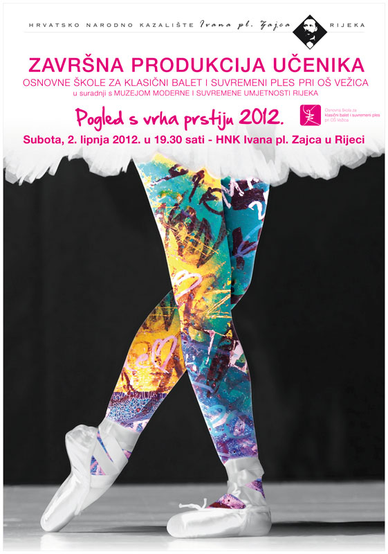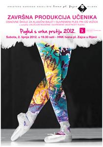 | Polaznici Osnovne škole za klasični balet i suvremeni ples koja u djeluje pri Osnovnoj školi Vežica u subotu, 2. lipnja 2012. s početkom u 19.30 sati, u riječkom će HNK Ivana pl. Zajca izvesti svoju već tradicionalnu cjelovečernju završnu produkciju i koncert pod nazivom ''Pogled s vrhova prstiju'', koja označava i kraj školske godine. |