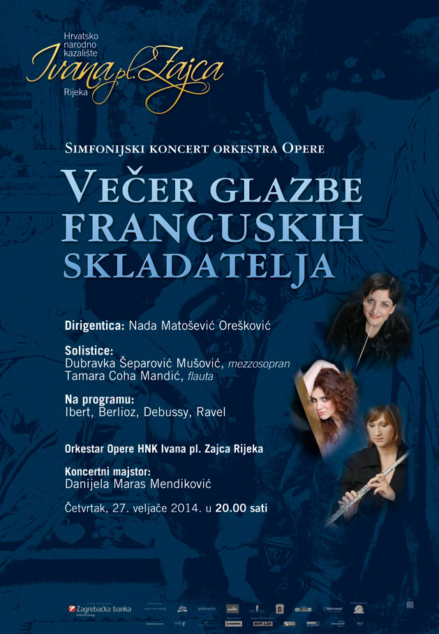 Dirigentica: Nada Matošević Orešković Solistice: Dubravka Šeparović Mušović, mezzosopran Tamara Coha Mandić, flauta Program: Jacques Ibert: Koncert za flautu i orkestar op. 37 - Allegro
