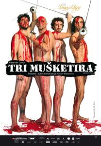 Alexandre Dumas TRI MUŠKETIRA glazbeni triler Redatelj i autor dramatizacije:Kokan Mladenović Dramaturginja: Magdalena Lupi Alvir Scenografkinja:Marija Kalabić Kostimografkinja:Tatjana Radišić Skladateljica: Irena Popović Autor tekstova songova: Predrag Lucić Oblikovatelj svjetla:Predrag Potočnjak Scensko mačevanje:Lovro Buva Asistentica kostimografa: Manuela Paladin Šabanović Osobe: Kralj Louis XIII – Mladen Vujčić Kardinal Richelieu, francuski premijer – Damir Orlić D`Artagnan, Gaskonjac – Igor Kovač Athos, mušketir – Jasmin Mekić Porthos, mušketir – Dražen Mikulić Aramis, mušketir – Alex Đaković Vojvoda od Buckinghama, engleski premijer – Rade Radolović Kraljica – Nika Mišković Milady, grofica de Winter, kardinalova povjerenica – Tanja Smoje Gospođica Bonacieux, kraljičina družbenica – Jelena Lopatić Kapetan de Treville, zapovjednik mušketira – Davor Jureško Ketty, sluškinja kod Milady – Marija Tadić Grof Rochefort, zapovijednik kardinalove garde – Predrag Sikimić Planchet, sluga kod mušketira – Denis Brižić Gardisti – Dmitrij Andrejčuk, Vitali Klok, Darko Petković, Tomislav Radinović Inspicijentice: Sandra Čarapina Ana Vidučić Šaptačica: Jolanda Pahor Premijera: 26. listopada 2013. Pisac francuskog romantizma Alexandre Dumas otac, proslavio se pustolovnim romanom Trimušketira (Les trios mousquetaires, 1844.) poznatog po zanimljivom zapletu, brojnim avanturama te hrabrim i simpatičnim junacima. Ovaj talentirani pisac bogate fantazije i živoga duha, svojim je povijesno-pustolovnim romanima utjecao na europsku popularnu literaturu kao i na filmsku umjetnost koja donosi brojne poznate ekranizacije njegovih djela. Radnja Tri mušketira, smještena na početak 17. stoljeća, uzbudljiva je priča o pustolovinama i prijateljstvu tri mušketira: Athosa, Porthosa i Aramisa te hrabrog mladog Gaskonjca D'Artagnana. Djelujući po poznatom načelu “svi za jednoga, jedan za sve!” ova družba zajedničkim snagama nastoji spriječiti pokvarenog kardinala Richelieua da zauzme francusko prijestolje. No njihova je najopakija protivnica kardinalova špijunka, Milady, jedna od najpamtljivijih ženskih “negativki” u literaturi. Dumas je ovdje upotrijebio svo svoje naracijsko umijeće puno brzih preokreta u radnji, da bi ovu priču o spletkama političkih i crkvenih moćnika u borbi za vlast i naklonost kralja i kraljice, okršajima, dvobojima, fatalnim špijunkama i skandaloznim tajnama, doveo do krajnjih napetosti i dramatične završnice.